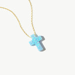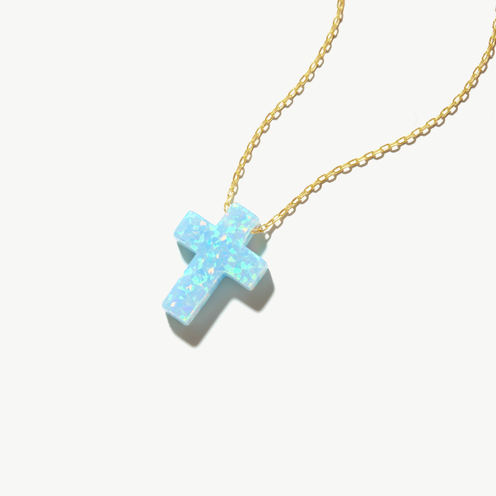 Crafted in 100% 14K solid gold, the delicate chain holds a shimmering blue opal cross pendant, designed to sit gracefully at the collarbone. Whether layered with other dainty chains or worn on its