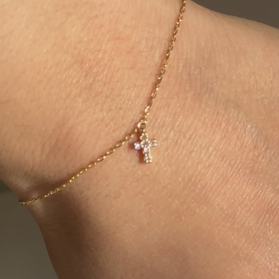 14K Real Solid Gold Cross Bracelet with F color diamonds, showcasing an elegant cross charm on a delicate gold chain, perfect for baptism gifts and religious occasions.