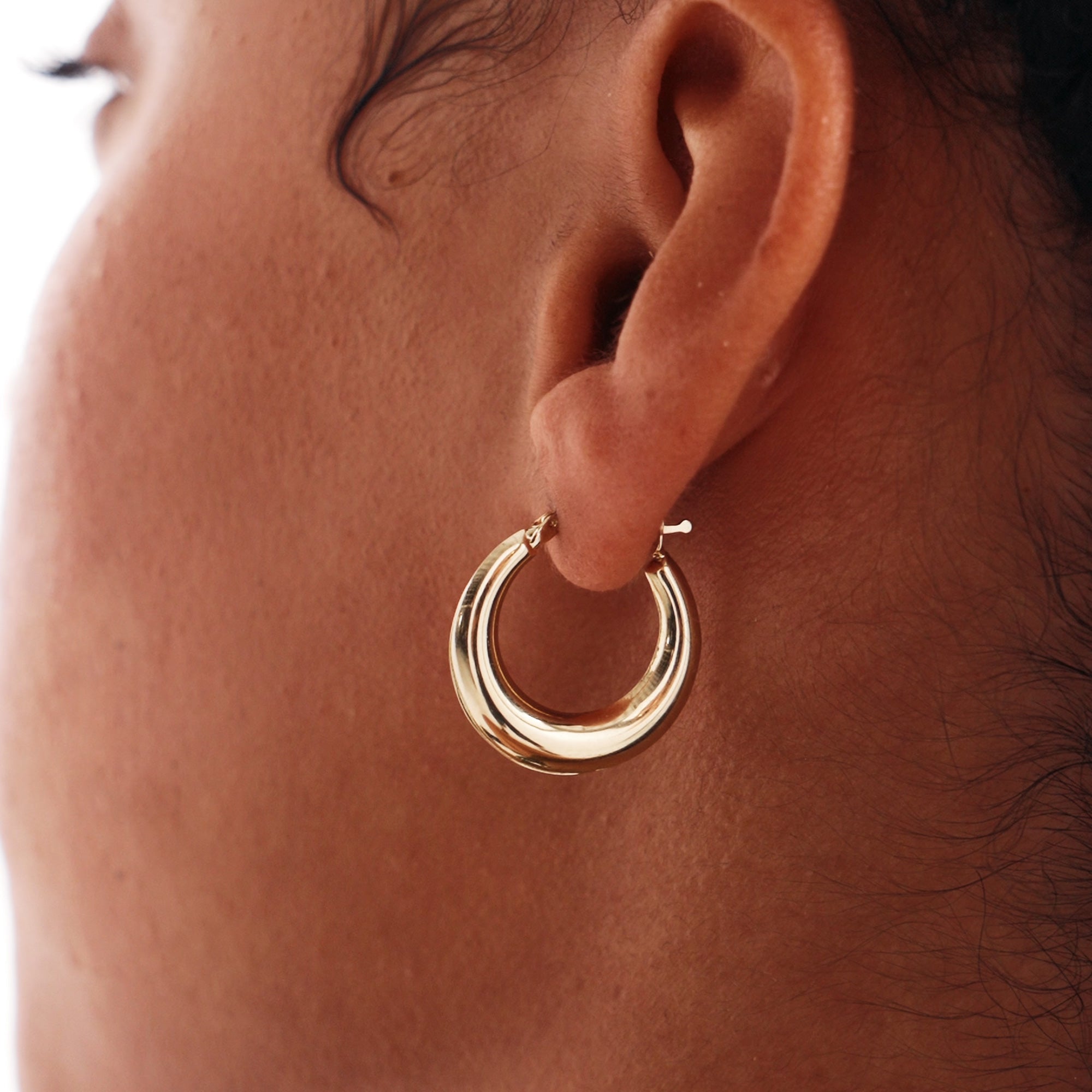 Madano Finest Thick Gold Moon Hoops are designed with a soft crescent silhouette that feels both modern and timeless. The rounded, chunky profile gives them presence, while the smooth high-polish finish keeps the look refined.