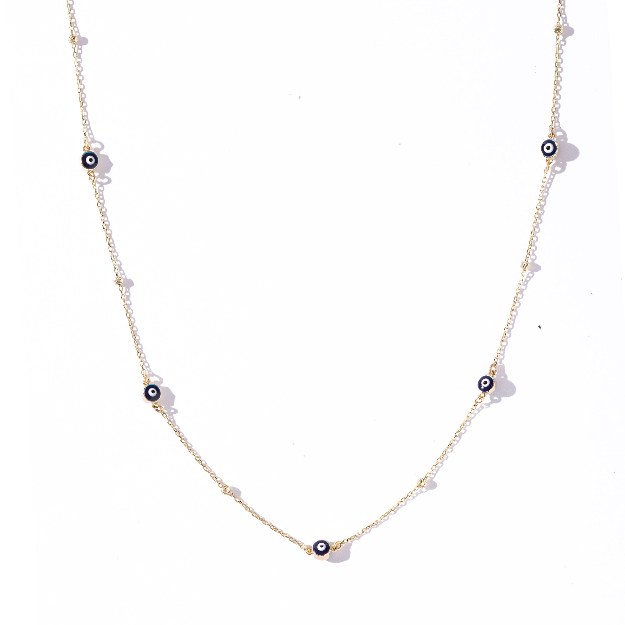 14K Solid Gold Evil Eye Station Necklace with Ball Beads