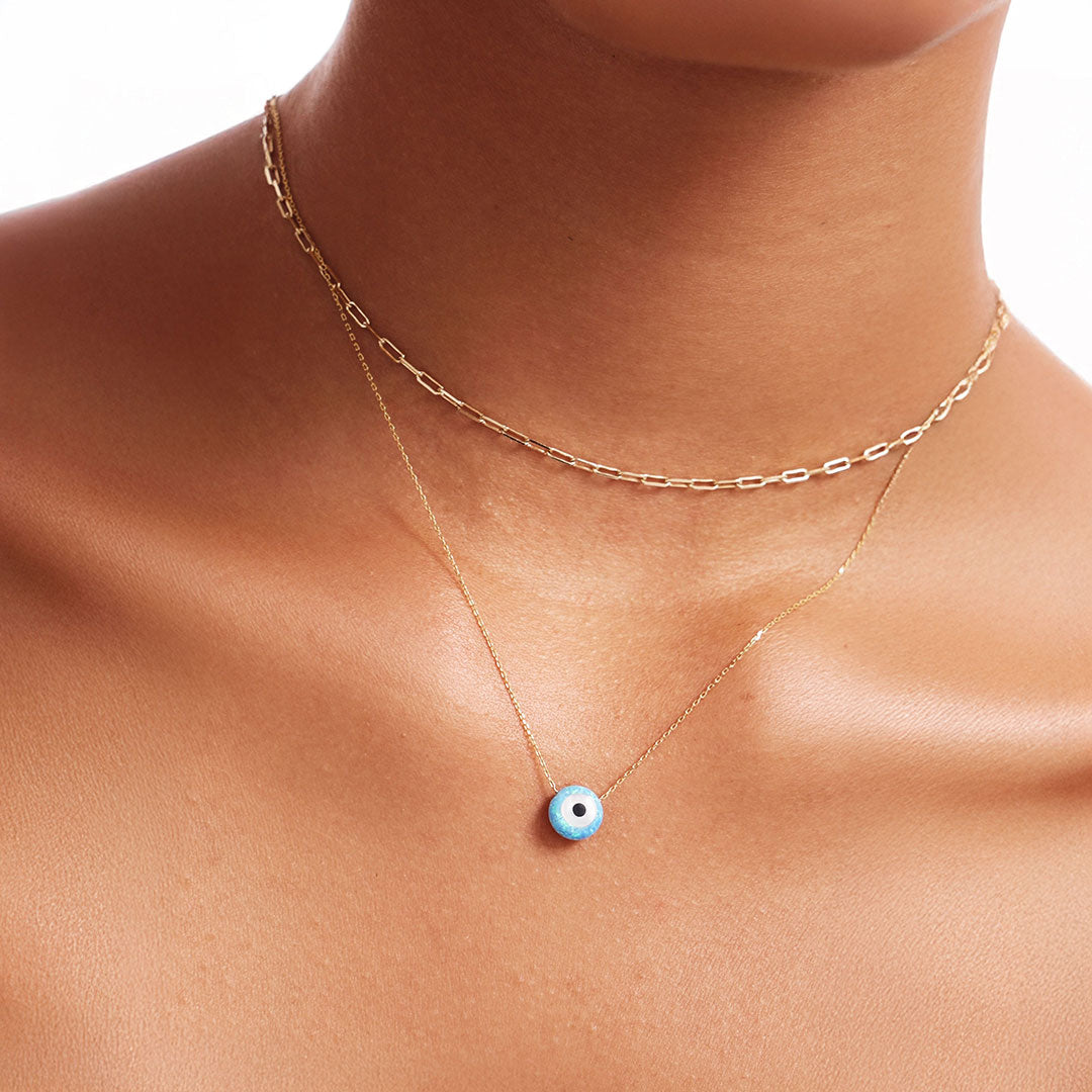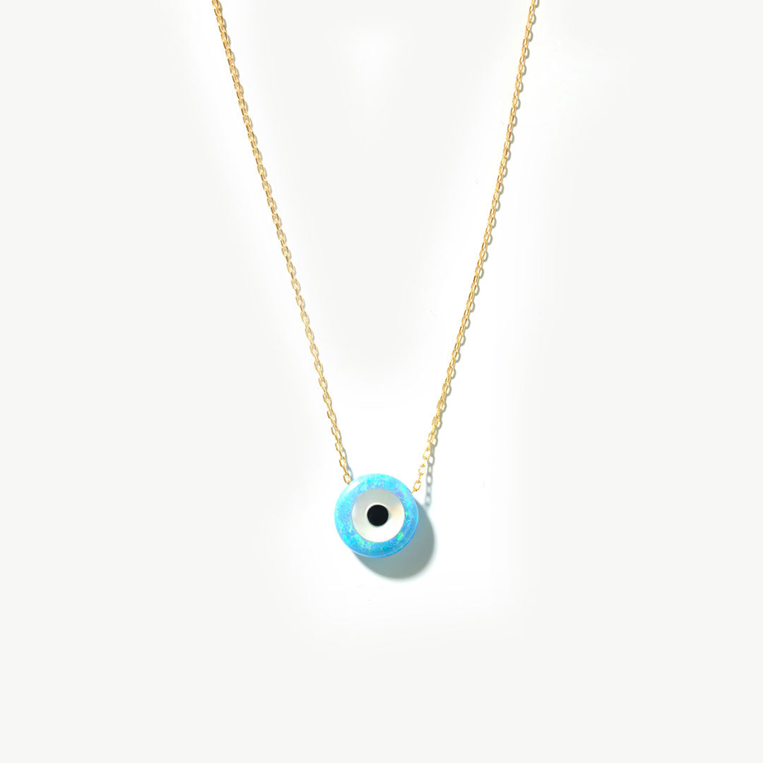 This 14K Solid Gold Blue Opal Evil Eye Necklace is more than just a beautiful piece of jewelry—it's a symbol of protection, luck, and light. Designed to reflect both ancient tradition and modern minimalism, it features a vibrant blue opal center that mirrors the mystique of the evil eye while honoring October birthstones in all their glowing glory.