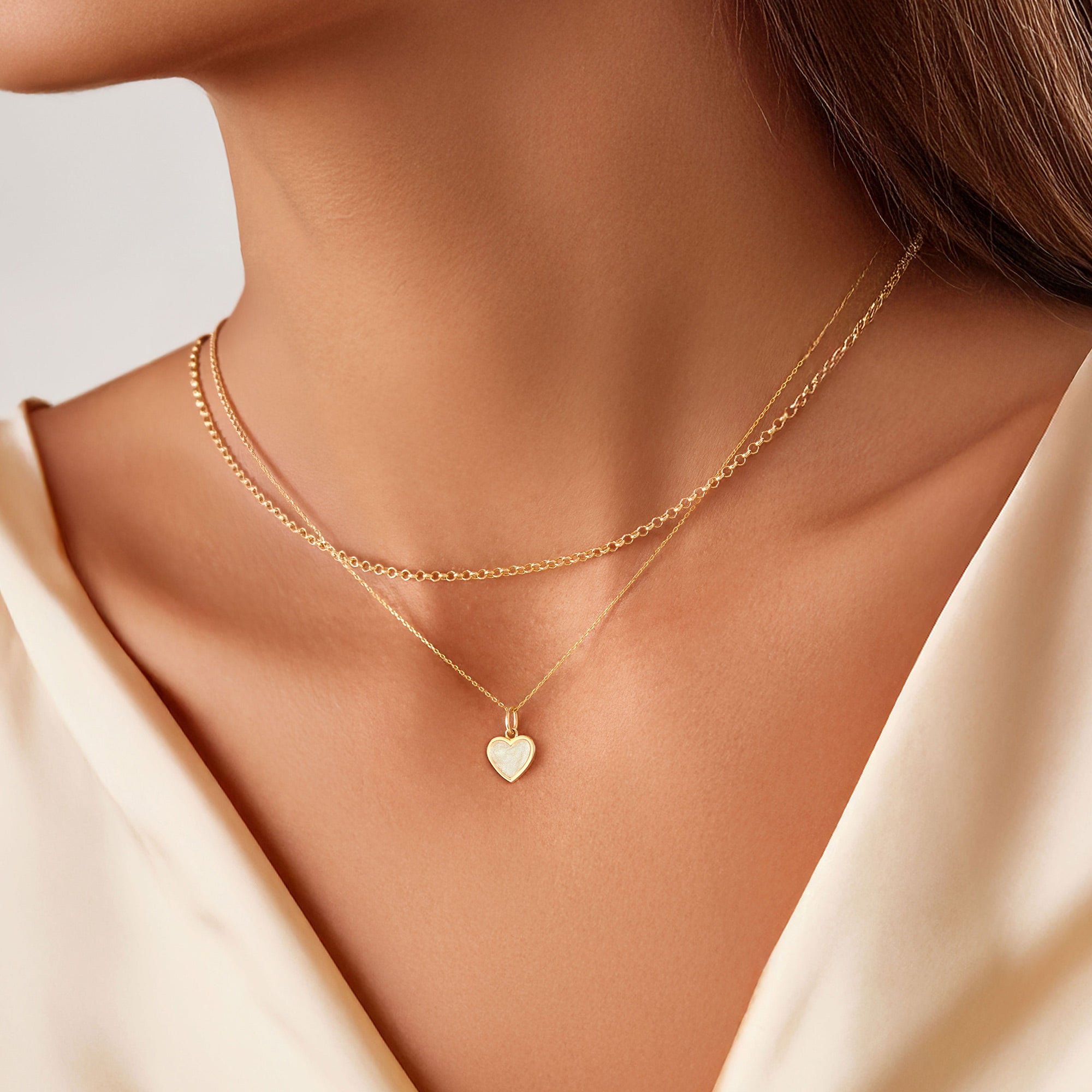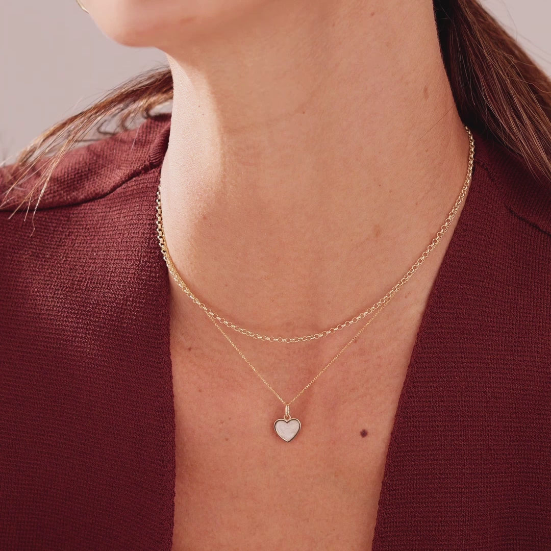 This exquisite 14K Gold Heart Shaped Mother of Pearl Pendant Necklace captures the essence of romance with its elegant design and luminous centerpiece. It's a perfect blend of classic charm and contemporary style, making it an ideal gift for someone special.