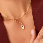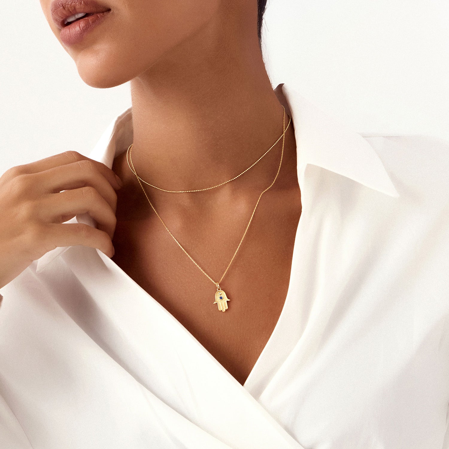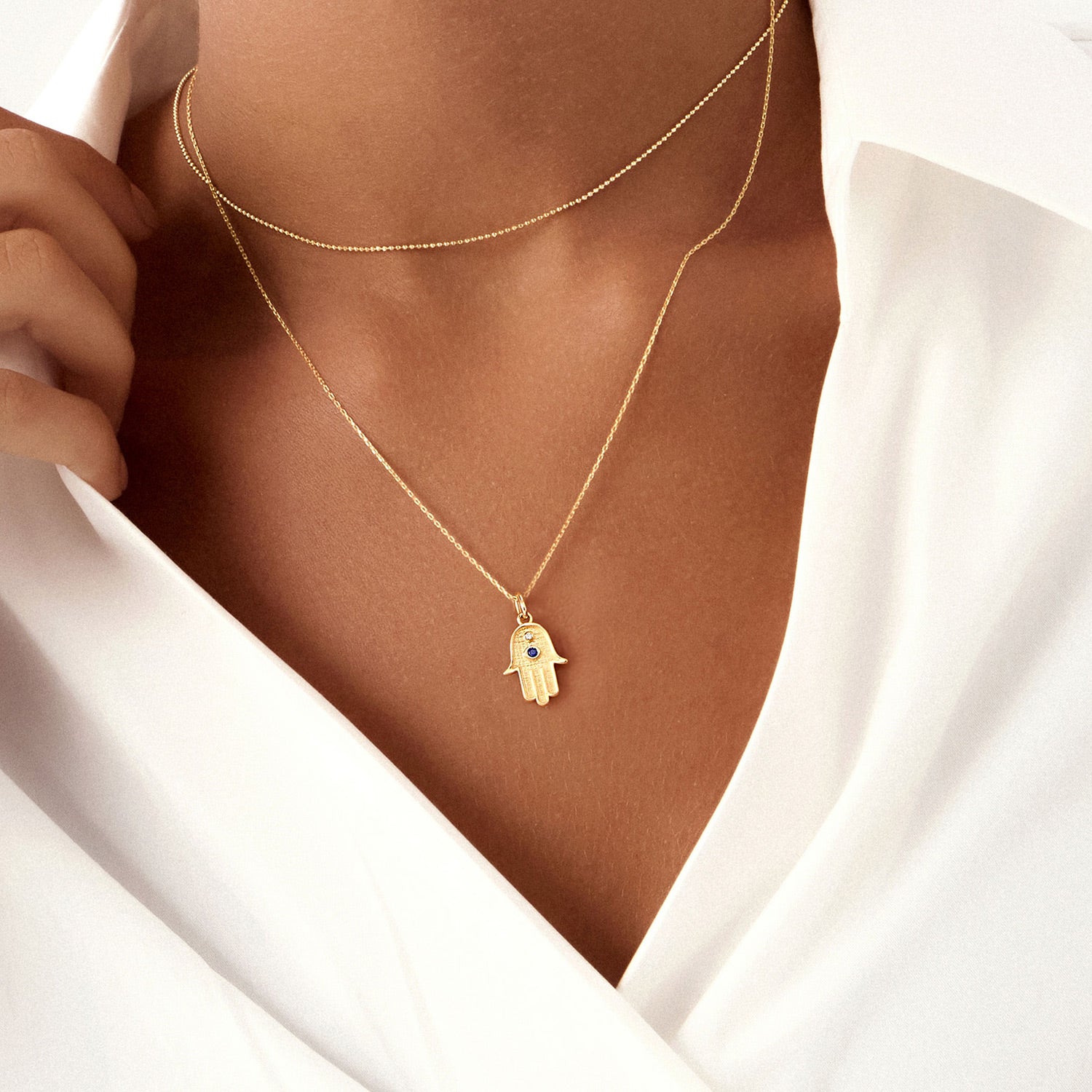 Embrace the protective aura of this 14K Gold Hamsa Hand Necklace, adorned with a sapphire and accented by diamonds. This iconic symbol of defense against the evil eye combines ancient charm with modern elegance, making it an excellent gift for safeguarding loved ones.