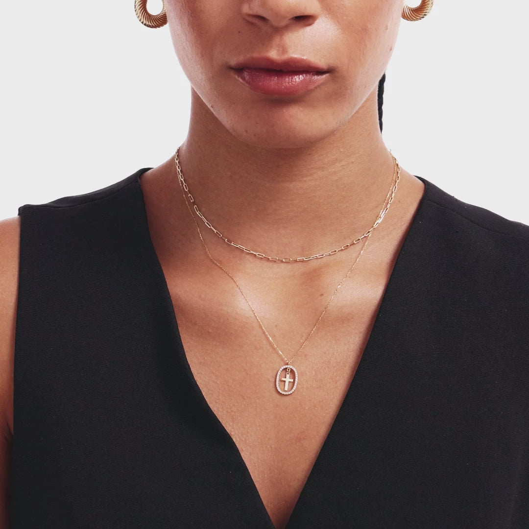 This majestic 14K Gold Cross Pendant Necklace is surrounded by sparkling cubic zirconia, emphasizing the cross’s sacred silhouette. It's an exceptional piece for anyone cherishing their faith with a touch of glamour.