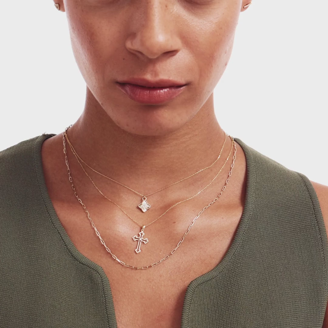 This delicate 14K Solid Gold Cross Necklace is a celebration of faith, simplicity, and April-born sparkle. Crafted with care, the openwork cross design brings a modern, lightweight look—while a shimmering cubic zirconia stone at its center honors the brilliance of the April birthstone.