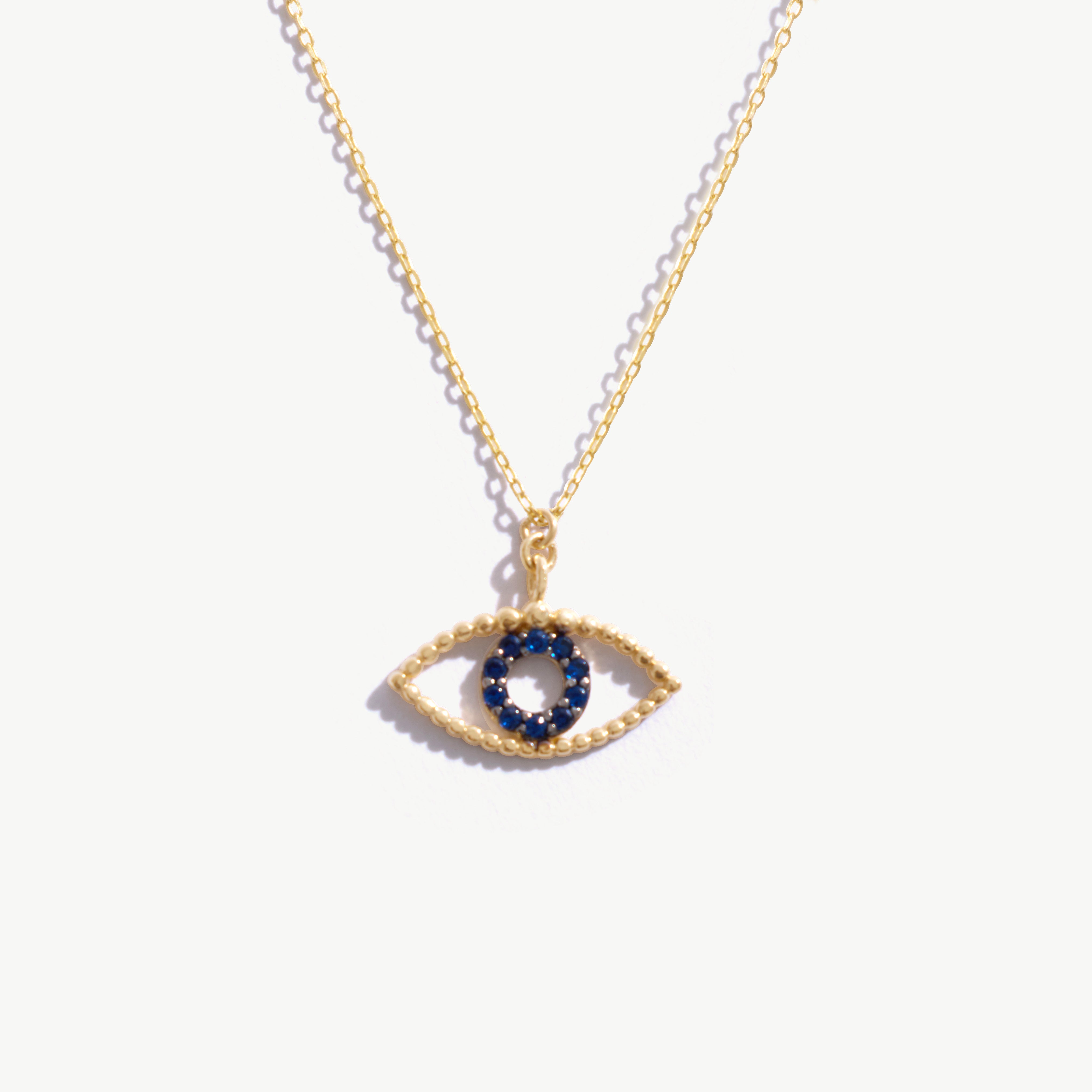 Embrace both style and protection with this 14K Real Solid Gold Evil Eye Necklace, designed with a striking high quality blue sapphire cubic zirconia gemstones at its center. The evil eye symbol is renowned for offering protection and warding off negative energy, making it both a beautiful and meaningful addition to any jewelry collection. This necklace features an eye-shaped pendant that’s perfect for everyday wear or as a unique layering piece. Ideal as a good luck charm or a Valentine’s Day gift, it’s a thoughtful way to show you care.