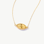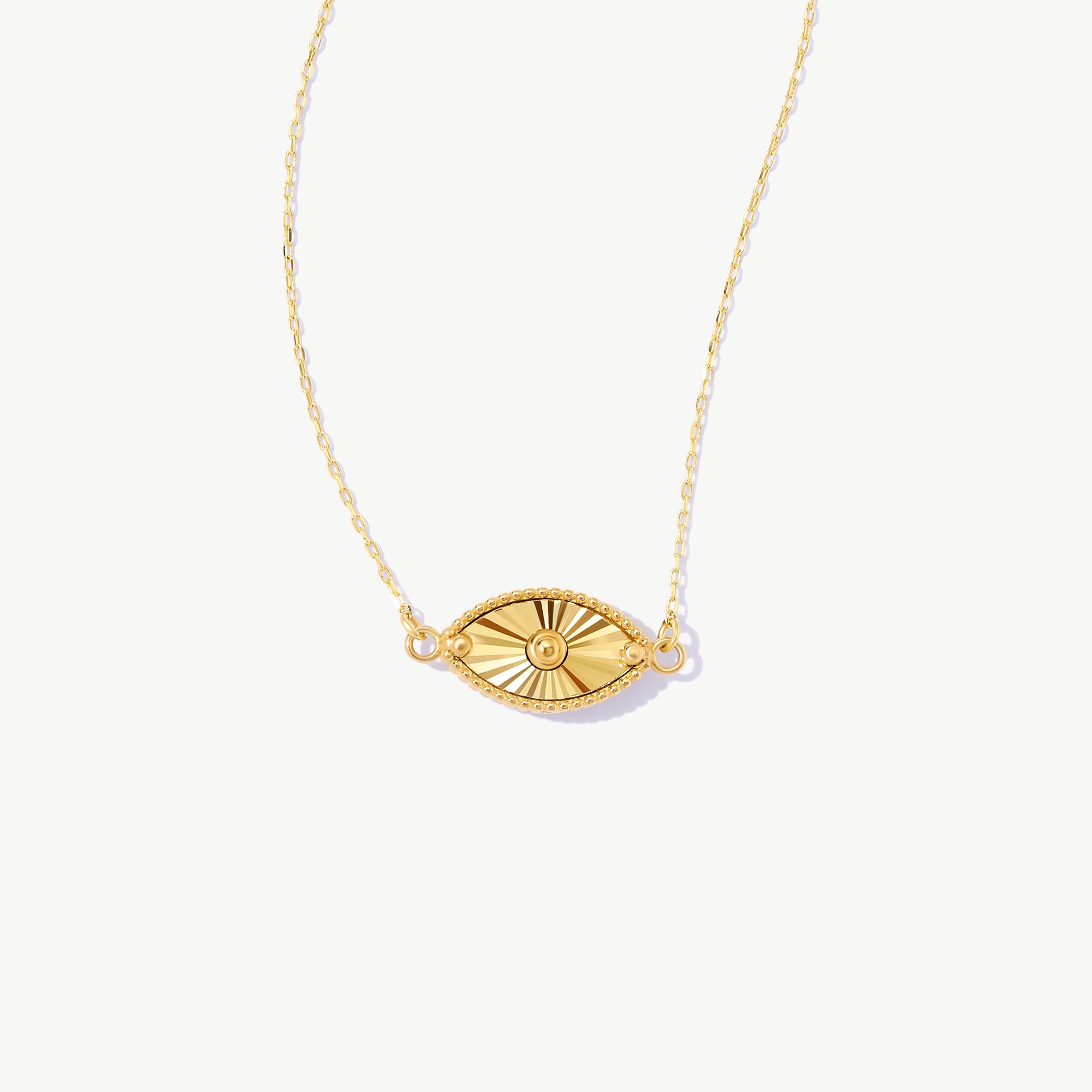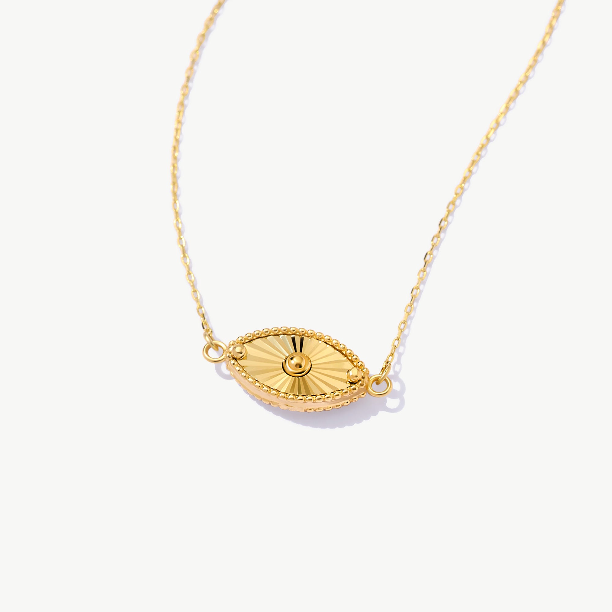 The pendant features a radiant center with carved sunburst details, surrounded by a delicate beaded frame that amplifies the eye-shaped silhouette. Its polished finish catches light beautifully, adding a glow to your everyday style while carrying centuries of symbolism.