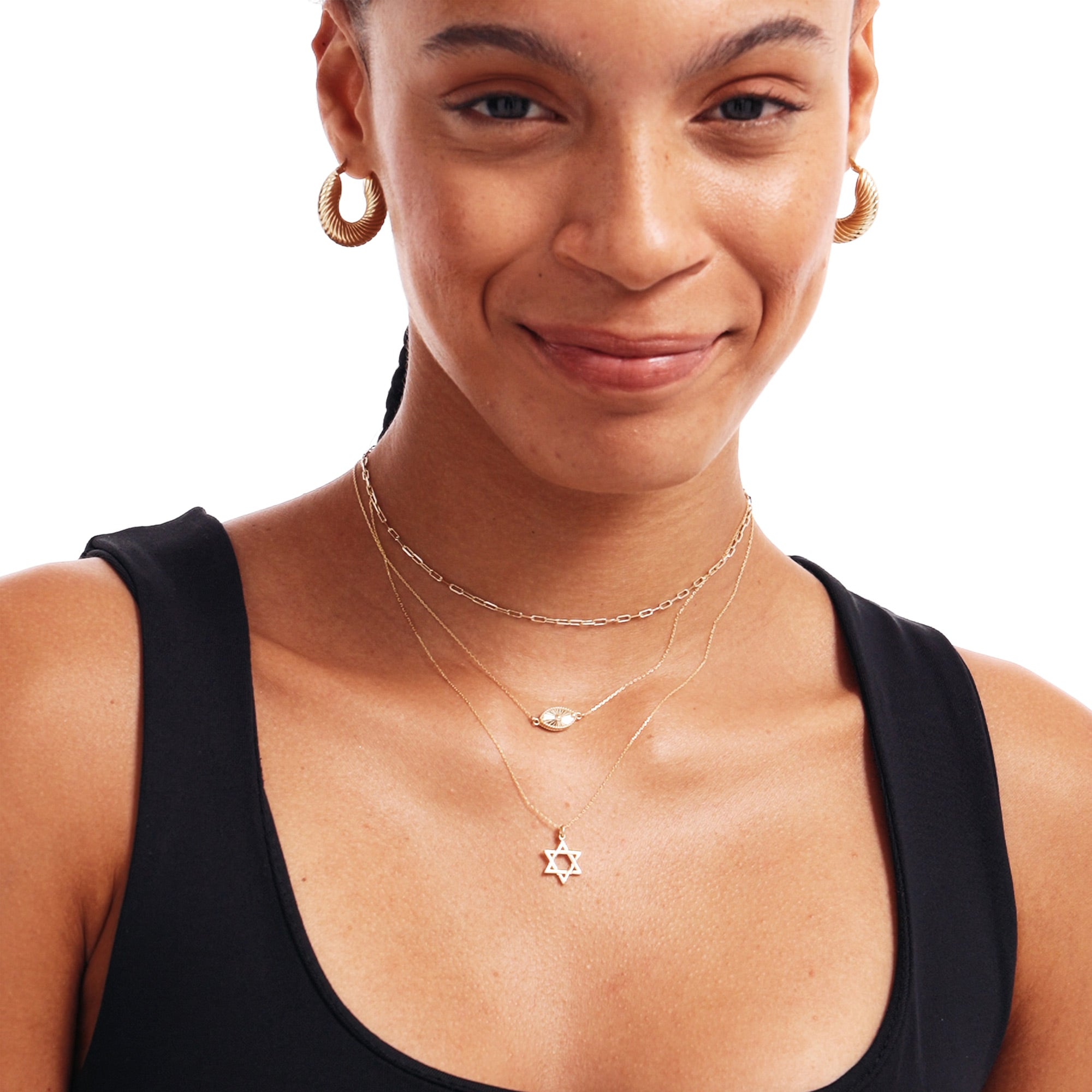 This 14k solid gold evil eye necklace brings together tradition, symbolism, and timeless design. Crafted in real gold—not plated, not filled—this amulet is meant to be worn every day as a subtle but meaningful shield of protection.