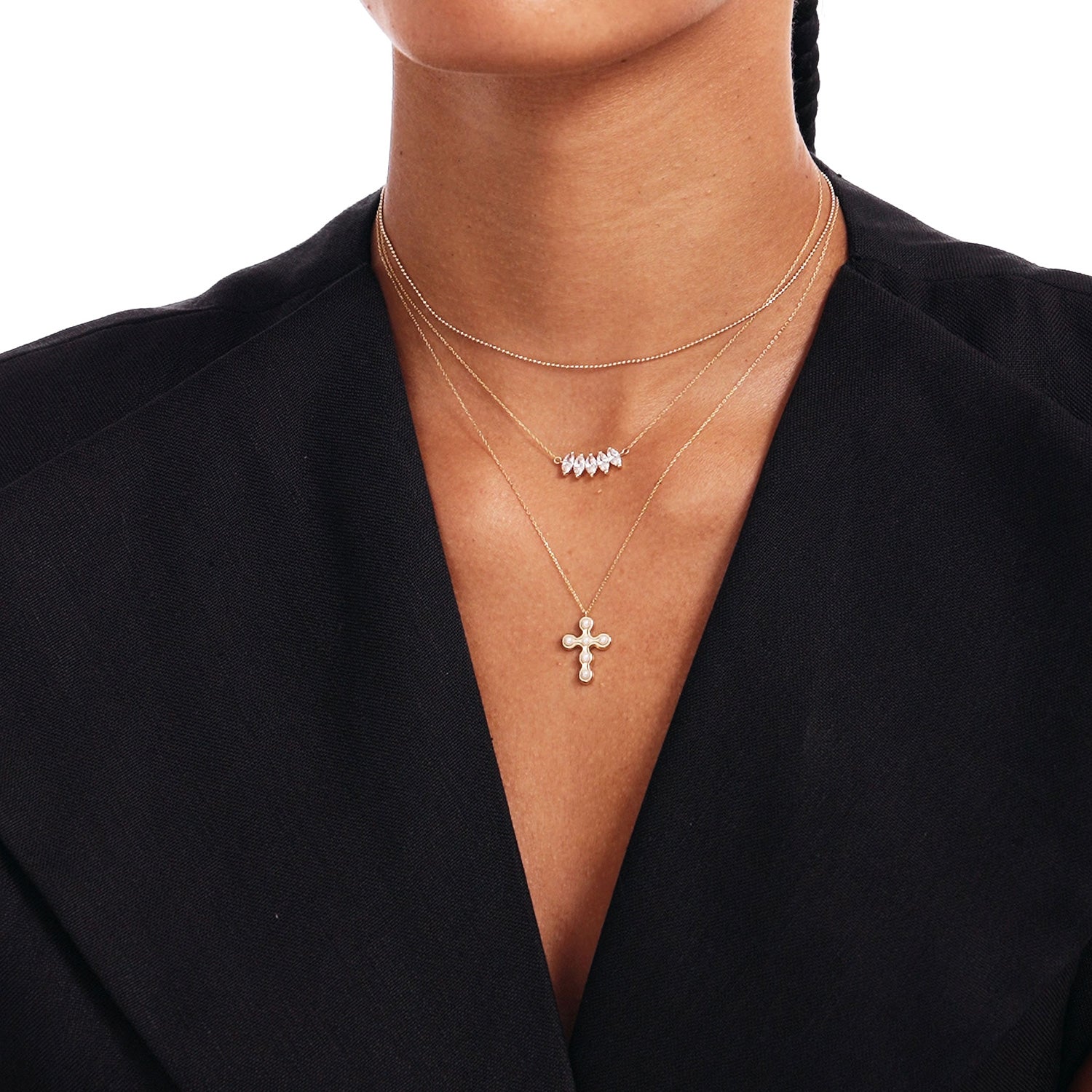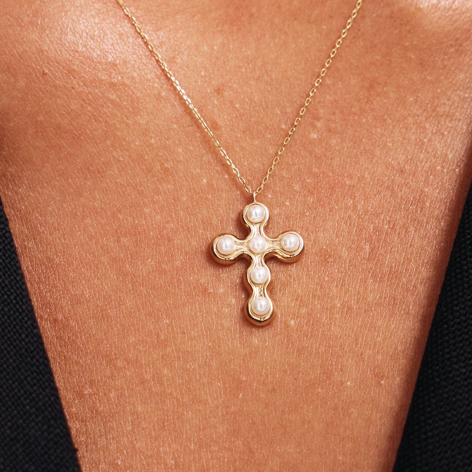 This elegant 14K Real Solid Gold Cross Necklace is adorned with luminous genuine pearls, combining spiritual symbolism with a modern, luxurious touch. With six softly glowing pearls nestled in a bold cross shape, this necklace is a heartfelt expression of faith, grace, and devotion.