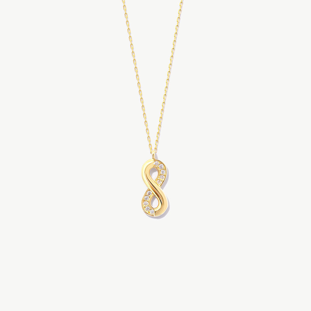 Celebrate your never-ending story with the 14K Real Solid Gold Infinity Necklace with Cubic Zirconia — where timeless symbolism meets radiant sparkle. This dainty pendant captures the eternal flow of life and love through its graceful infinity shape, illuminated with dazzling cubic zirconia stones set into its curves.