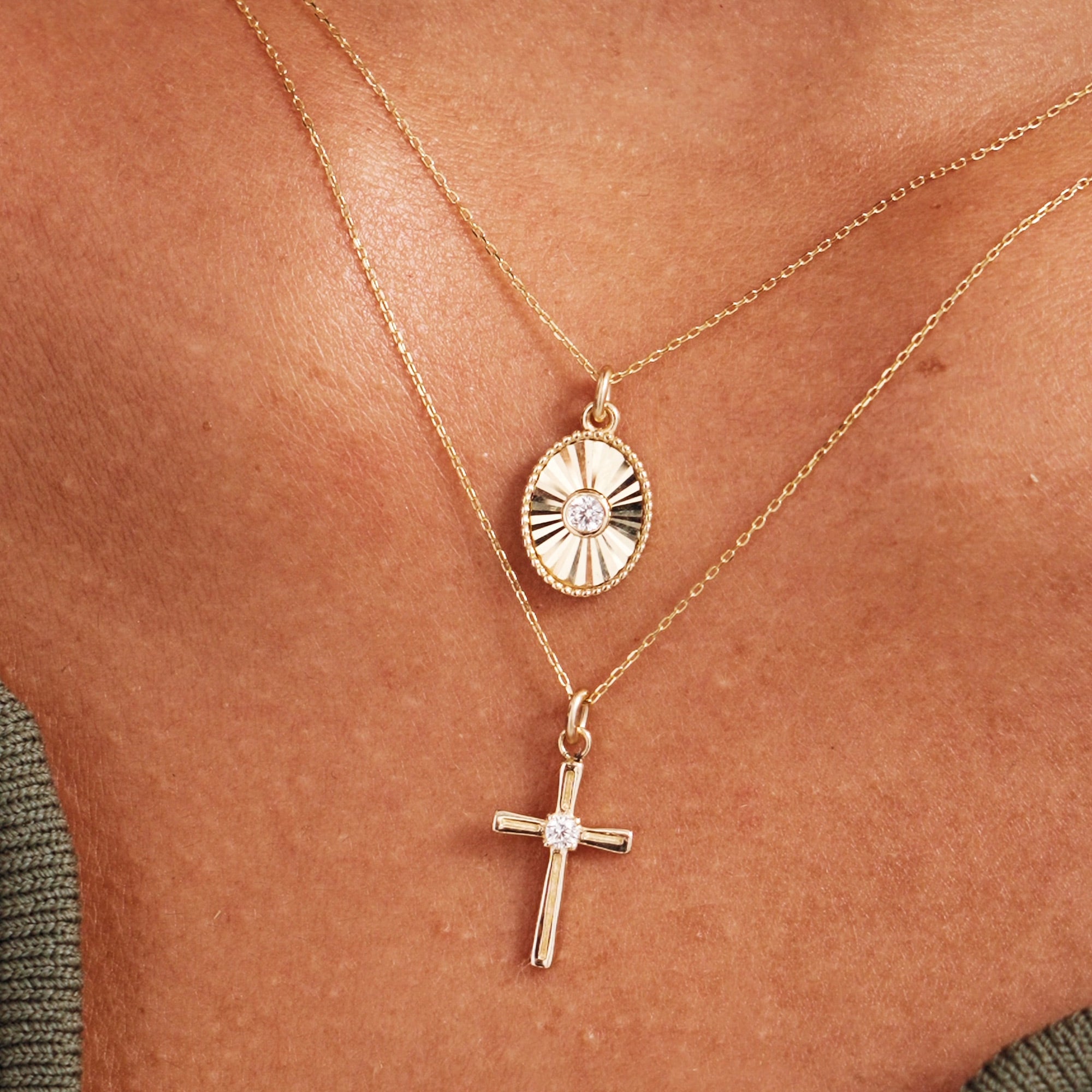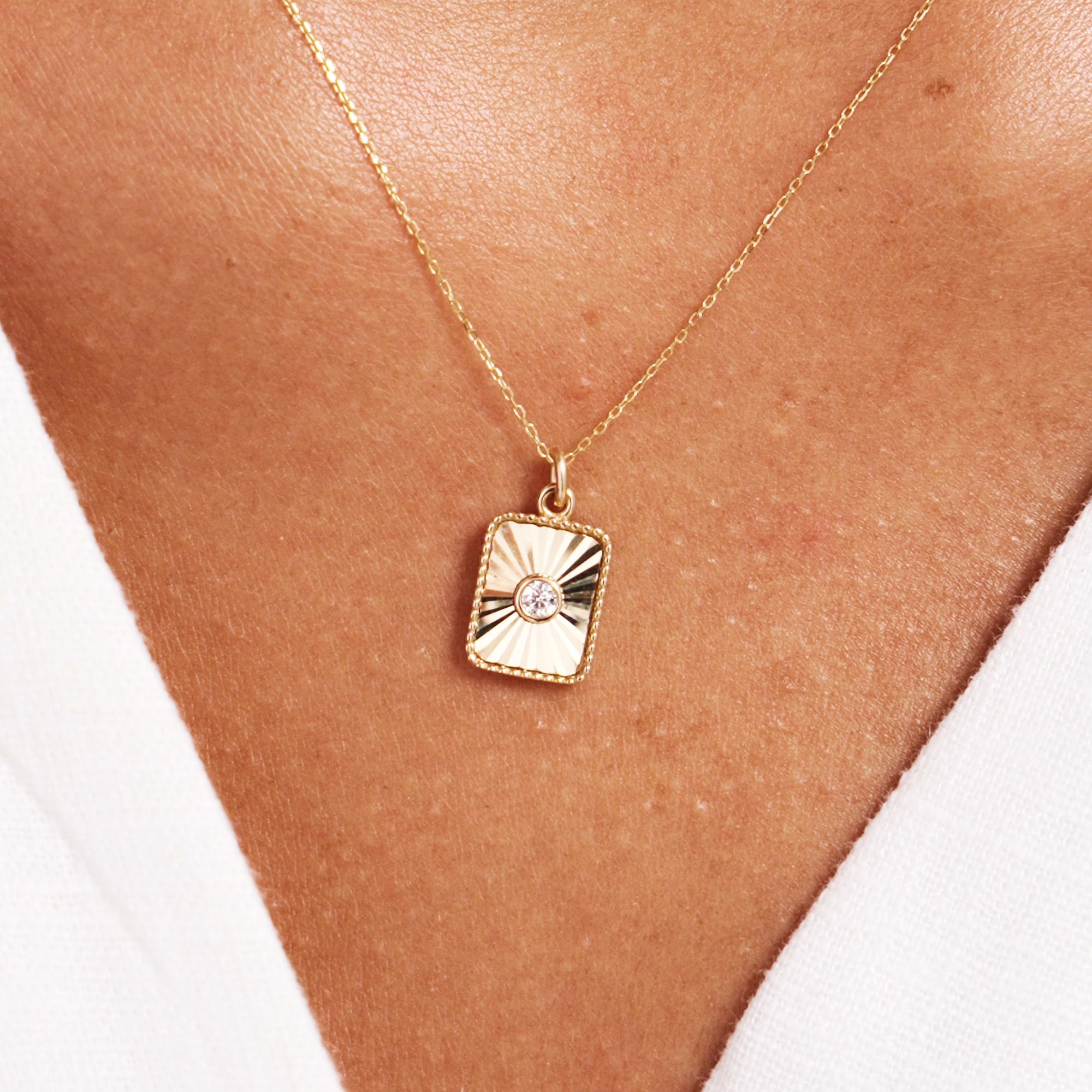 Discover the beauty of minimalism with these 14K Real Solid Gold Dainty Pendant Necklaces, available in both oval and rectangle designs. Each pendant features a sunburst-inspired texture radiating from a delicate cubic zirconia centerpiece, adding a subtle sparkle that makes these necklaces perfect for everyday wear.
