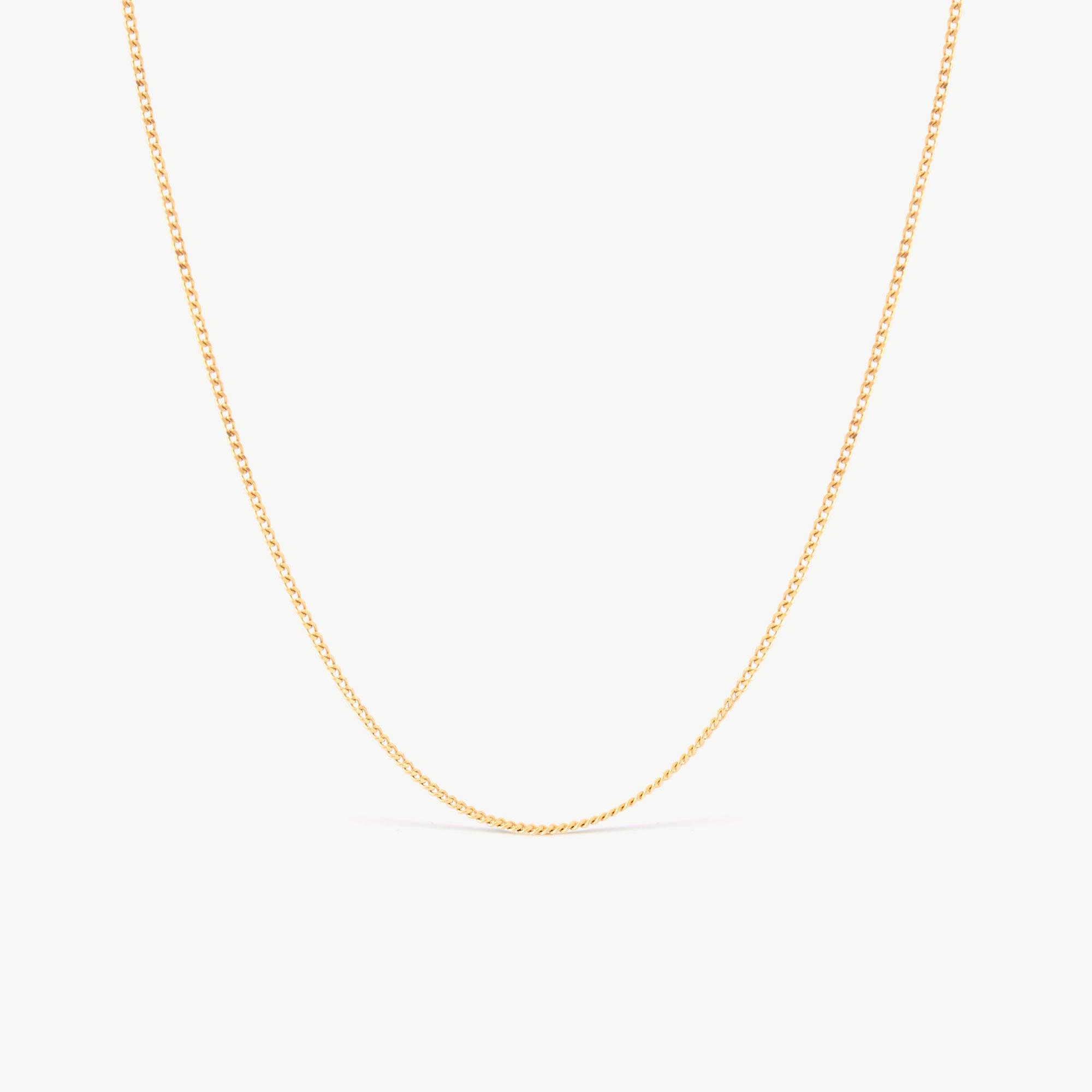 Real 14K yellow gold Cuban link chain necklace, showcasing a thin and delicate curb design. This minimalist gold chain is perfect for layering or wearing alone, offering a simple yet sophisticated style for everyday or evening wear.